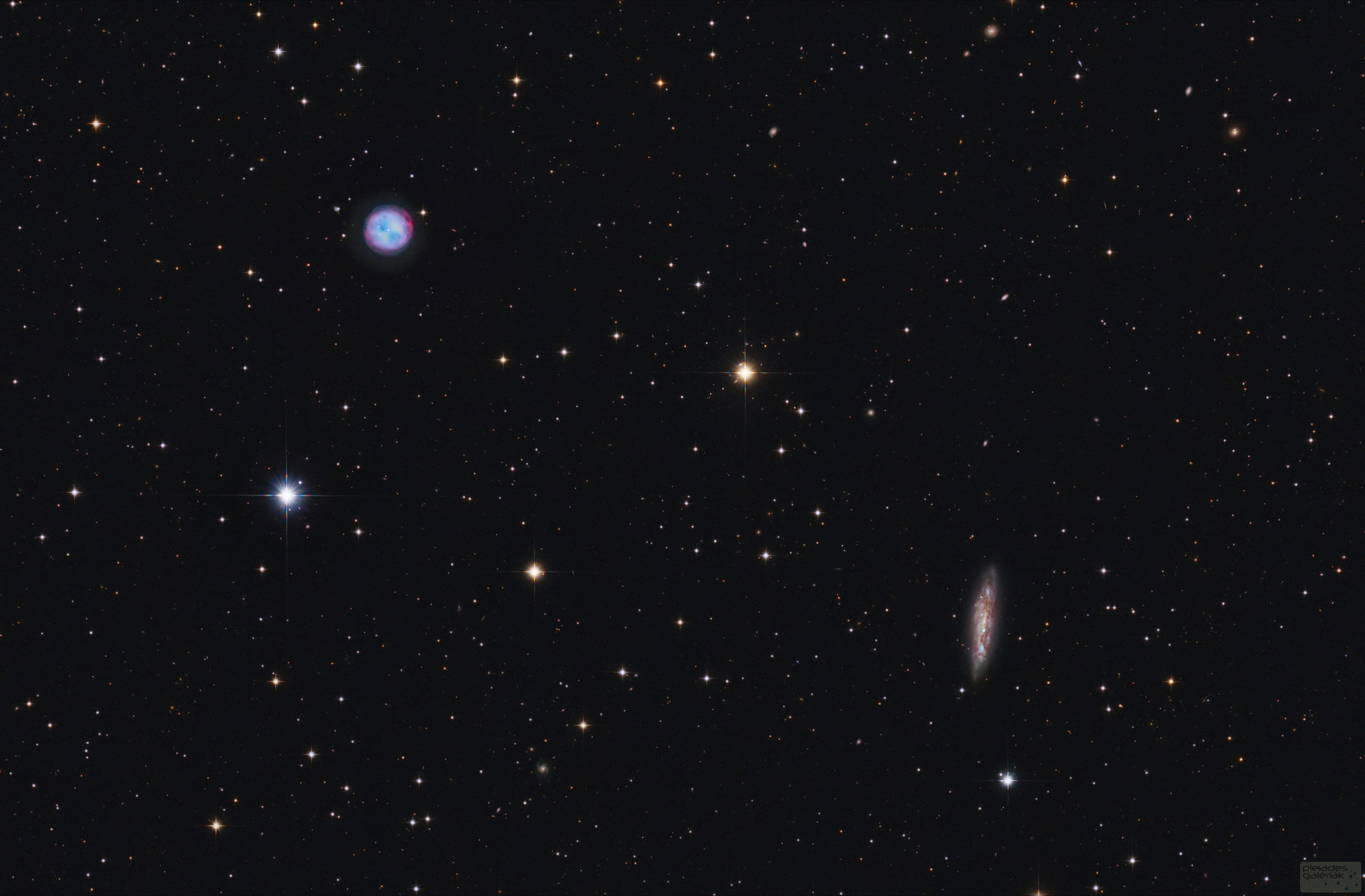 Az éjszakai égbolt telis-tele van állatokról elnevezett csillagképekkel. Talán nem meglepő, hogy a Nagy Medve csillagképben egy bagoly is lakik. A március eleji erős hidegfront-betörést követő éjszakán gyönyörű, tiszta és jó átlátszósággal bíró égbolt fogadott. Némi hezitálás után úgy döntöttem, az egyenként talán nem túl látványos, de az eltérő jellegük és karakterük miatt egy közös képen különleges hangulatot nyújtó M97 és M108 kettőst fotózom le az Ursa Maiorban. A két objektum közül talán az M97 besorolású planetáris nyújt esztétikailag többet. Bagoly köd néven vált ismertté Lord Rosse közel napra pontosan a fotóm előtt 163 évvel (1848 március 11-én) elkészült rajza után. Lord Rosse 183 cm-es távcsövén keresztül bagolyformát látott, elkülönülő szemekkel (lásd a bal oldali kép). Teljes vizuális magnitúdója 11, de nem olyan könnyű észrevenni, mert fénye közel 3 ívperc átmérőjű területen oszlik meg. Az M108 nagyjából az éléről látszódó, elnyúlt alakú 8’36 x 2’24 méretű, 10 magnitúdós Sc típusú spirál. Távolsága 25 millió fényév és 760 km/s sebességgel távolodik tőlünk.
