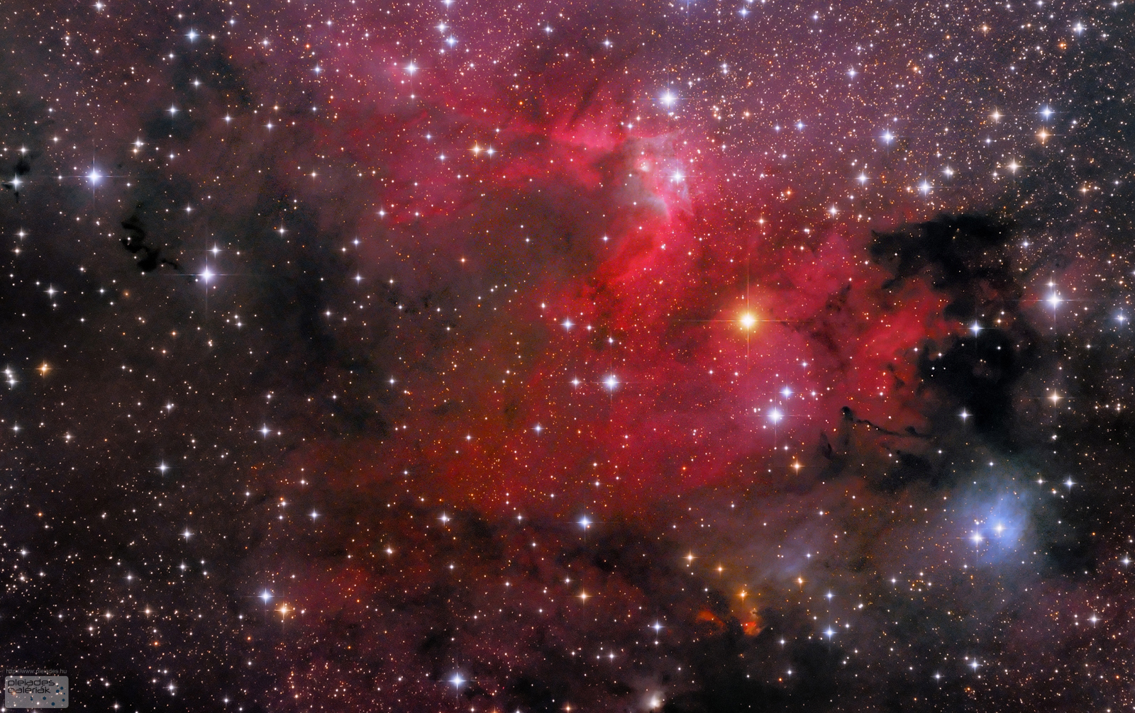 A Cepheus csillagkép az északi égbolton, a Pólushoz közel található csillagkép, amelyen keresztülhúzódik a Tejút sávja. Területén számtalan nyílthalmaz és kozmikus por- és gázfelhő helyezkedik el, köztük a Sharpless 2-155, amely egy ásító, hatalmas égi barlangnyílásra emlékeztető sötét területet ölel körül. Emiatt kapta elnevezését is: Barlang-köd. A nemrég elhunyt brit ismeretterjesztő, Sir Patrick Moore katalógusában (Caldwell katalógus) a 9. sorszámot viselő köd feltehetően az asztrofotósok miatt került be ebbe a híres válogatásba, ám Stephen J. O’Meara hawaii-i amerikai amatőrcsillagász észlelése alapján vizuálisan is látható – ehhez 15 cm körüli műszerre, tökéletesen sötét égre, és esetleg egy ködszűrőre van szükség. Az égi barlang bejárata 2400 fényév messzeségben tátong, körülötte gázfilamentek világítanak, sötét öblök türemkednek be, és néhol kékesen ragyog a csillagok körül a por.