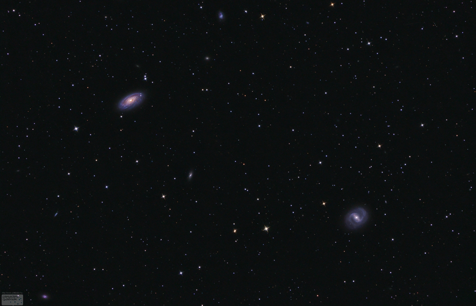 A fotón a Virgo csillagképben található rengeteg galaxis közül az M88 és az M91 párosa látható. Az előbbi, mintha az Androméda-köd kicsinyített mása lenne. Elnyúlt alakú, kb 5 ívperc hosszú, 2.5 ívperc széles spirálgalaxis. Teljes fénye egy 9 magnitúdós csillagéval azonos. Mallas 10cm-es refraktorában nagyserű objektum. Felületi szerkezete sima, fényessége egyenetlen. A külső részei vizuálisan már kis távcsőben nem érzékelhetőek. 40 millió fényév távolságra van tőlünk. A jobb alsó sarokban található M91 az egyik “elveszett” Messier objektum. Még azt is hitték, hogy az 1781-es megfigyelés egy ismeretlen üstökösre utal. 9.5 magnitúdós horgas spirálgalaxis, majdnem a lapjáról látszik.