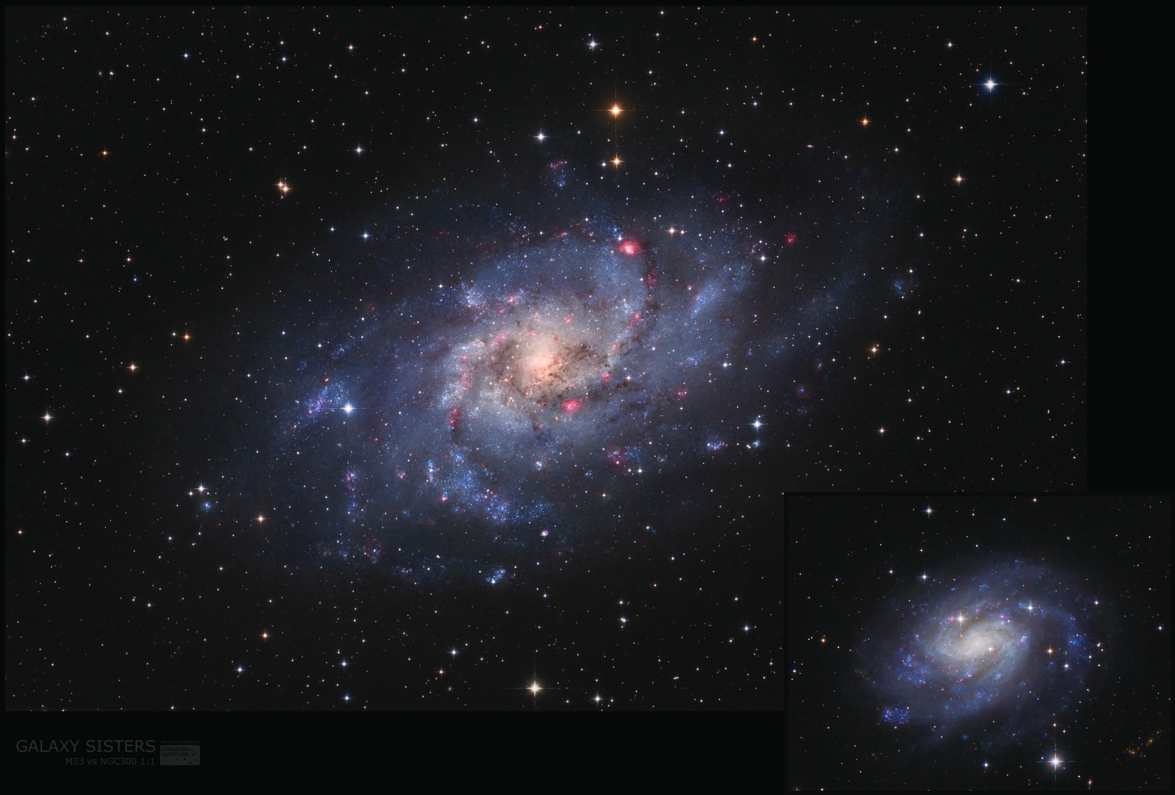 A Triangulum csillagképben látható galaxisszomszédunk, az M33 déli megfelelője, az NGC 300. Most egy képen hasonlítható össze a két csillagváros, 1:1 méretezésben. Mindkét galaxisra jellemzőek a fényes csillagkeletkezési régiók és az emissziós vörös ködök is jól látszanak.
