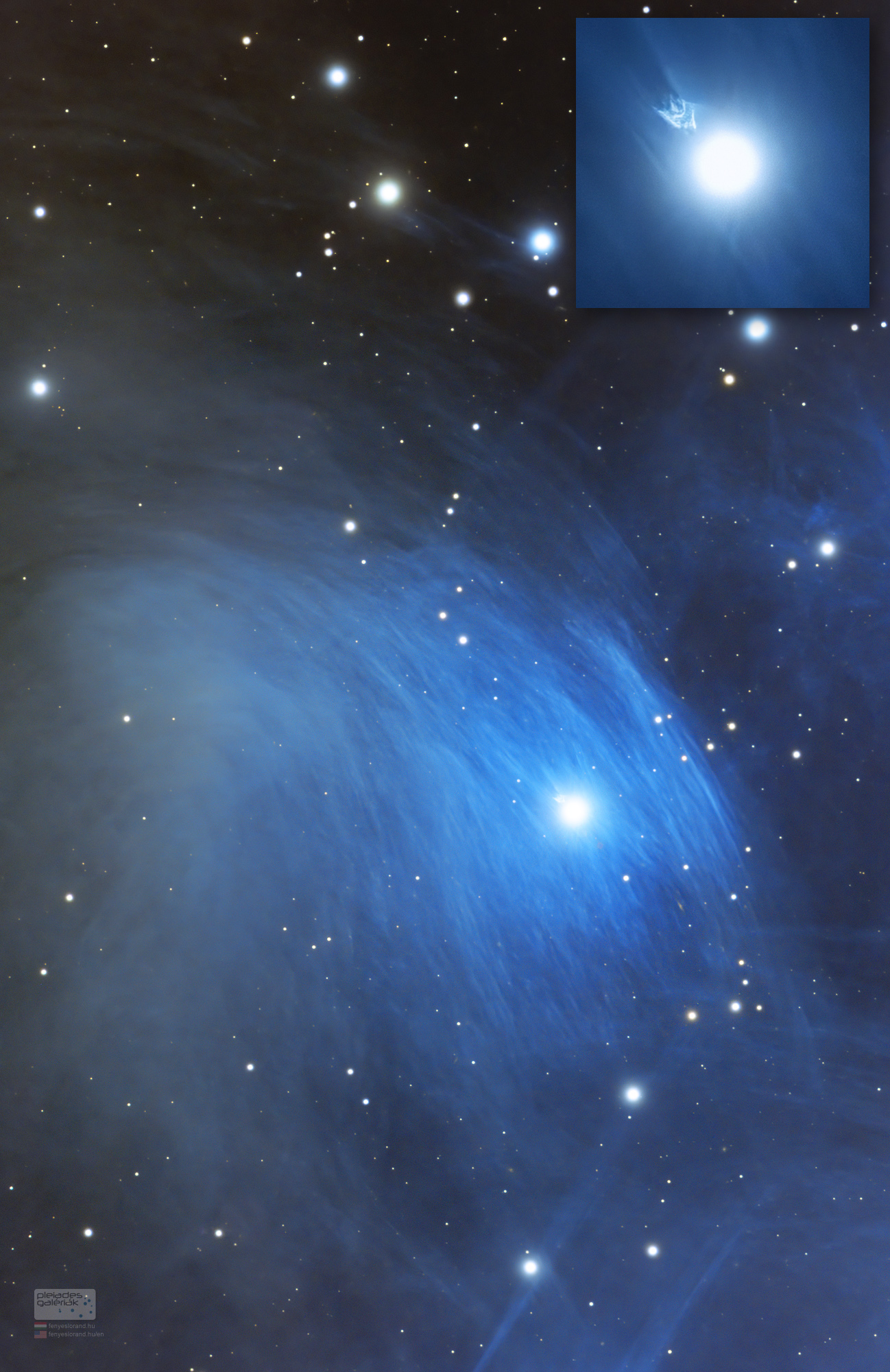 A nagy képet a Meropétől délre elterülő NGC 1435 katalógusszámú diffúz-köd uralja. Ragyogó fényessége, szálai lenyűgöző látványt nyújtanak. Merope-ködként ismerjük. A felületi fényessége 4 magnitúdó, 359 fényévre található a Naprendszerünktől. Átmérője eléri a 3 fényévet. Azonban ezen a képen nem ő a főszereplő, hanem az IC 349 katalógusszámú apróság, amit 1890 novemberében fedezett fel Edward Emerson Barnard amerikai csillagász, aki üstököshöz hasonlító ködösségként írta le. Sherburne Wesley Burnham sokkal érdekesebbnek tartotta, mint a Plejádokon vizuális és fényképészeti módszerekkel eddig felfedezett ködök bármelyike, illetve “az égbolt egyik legkülönlegesebb objektumának” nevezte. Burnham azt is feltételezte, hogy az IC 349 kapcsolatban áll a Plejádokkal. Azonban a későbbi vizsgálatok azt mutatják, hogy nem követi a Plejádok mozgását és irányát, ami arra utal, hogy az objektumok véletlenül találkoznak egymással. Az IC 349 valószínűleg a közeli Taurus molekulafelhő-komplexum része.