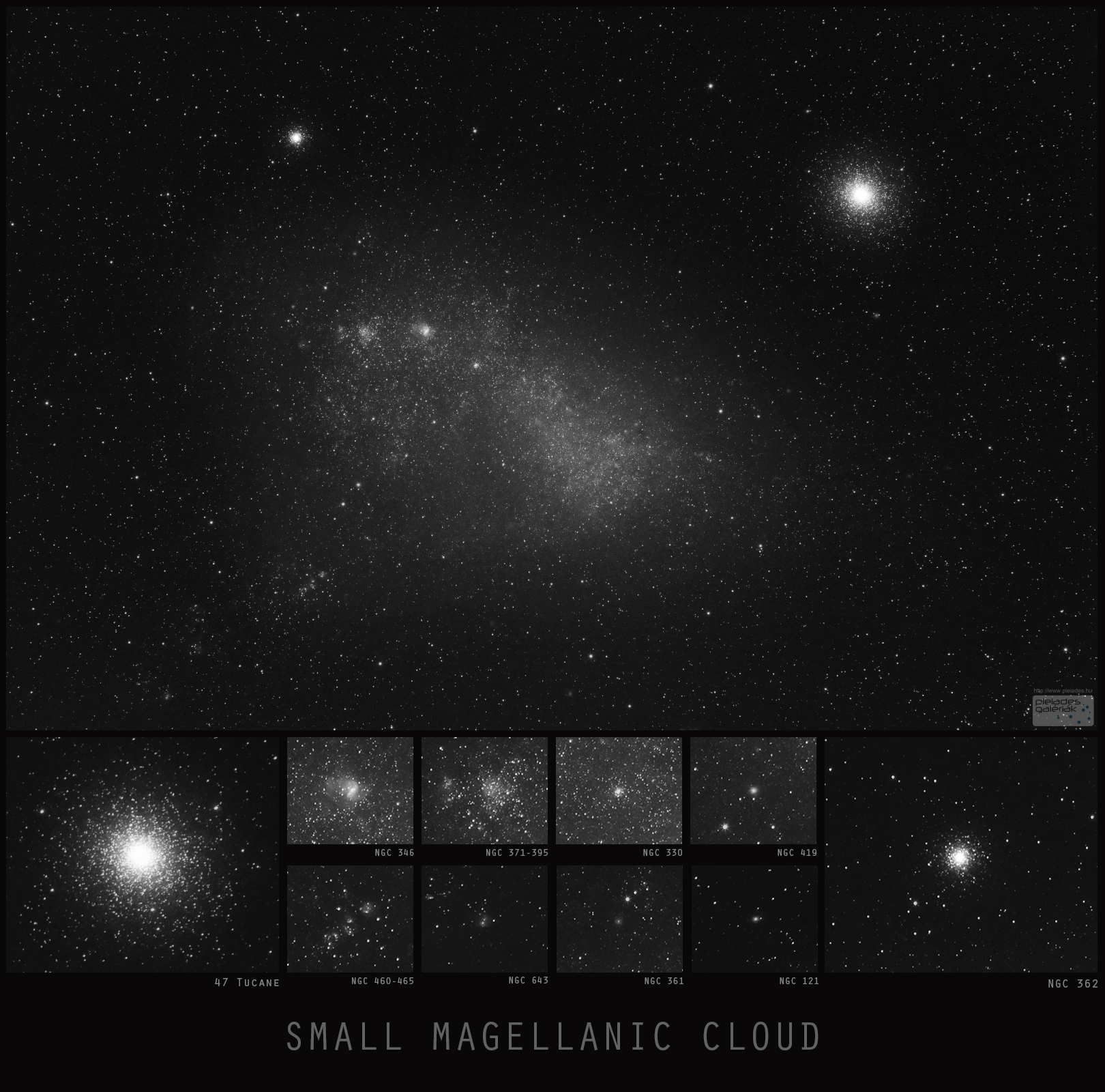 A Kis Magellán-felhő törpegalaxis, amely Tejútrendszerünk körül kering. Több százmillió csillagot tartalmaz. A Nagy Magellán-felhővel alkotnak párost, amitől nyugati irányban 20 foknyira található. A Lokális Galaxiscsoport kilencedik legnagyobb luminozitású objektuma. Ferdinand Magellanról nevezték el, aki Föld körüli útja során figyelte meg a Nagy Magellán-felhővel együtt. Valamikor horgas spirálgalaxis lehetett, mint a Tejútrendszer, de ennek ereje szabálytalanná torzította alakját. A központi részében még mindig fel lehet fedezni a strukturált szerkezetet. Sajnos a kép készítésekor színi hiba lépett fel. Nagyon sajnáltam volna ennek ellenére félrerakni ezt a fantasztikus témát (főleg azért is, mert hazai fotósok ritkán örökítik meg), ezért kivételesen egyfajta fotografikus észlelésként, monoban osztom meg. Néhány objektumot kiemeltem a rengetegből, bár annyi van, hogy 8x ennyi kis kocka sem lenne elég. Köztük nem egy “előtte” van – pl a nagy gömbhalmazok, amik a mi Tejútrendszerünk részei. Illetve választottam néhány távoli galaxist is (pl NGC 643), amik persze jóval távolabb vannak.