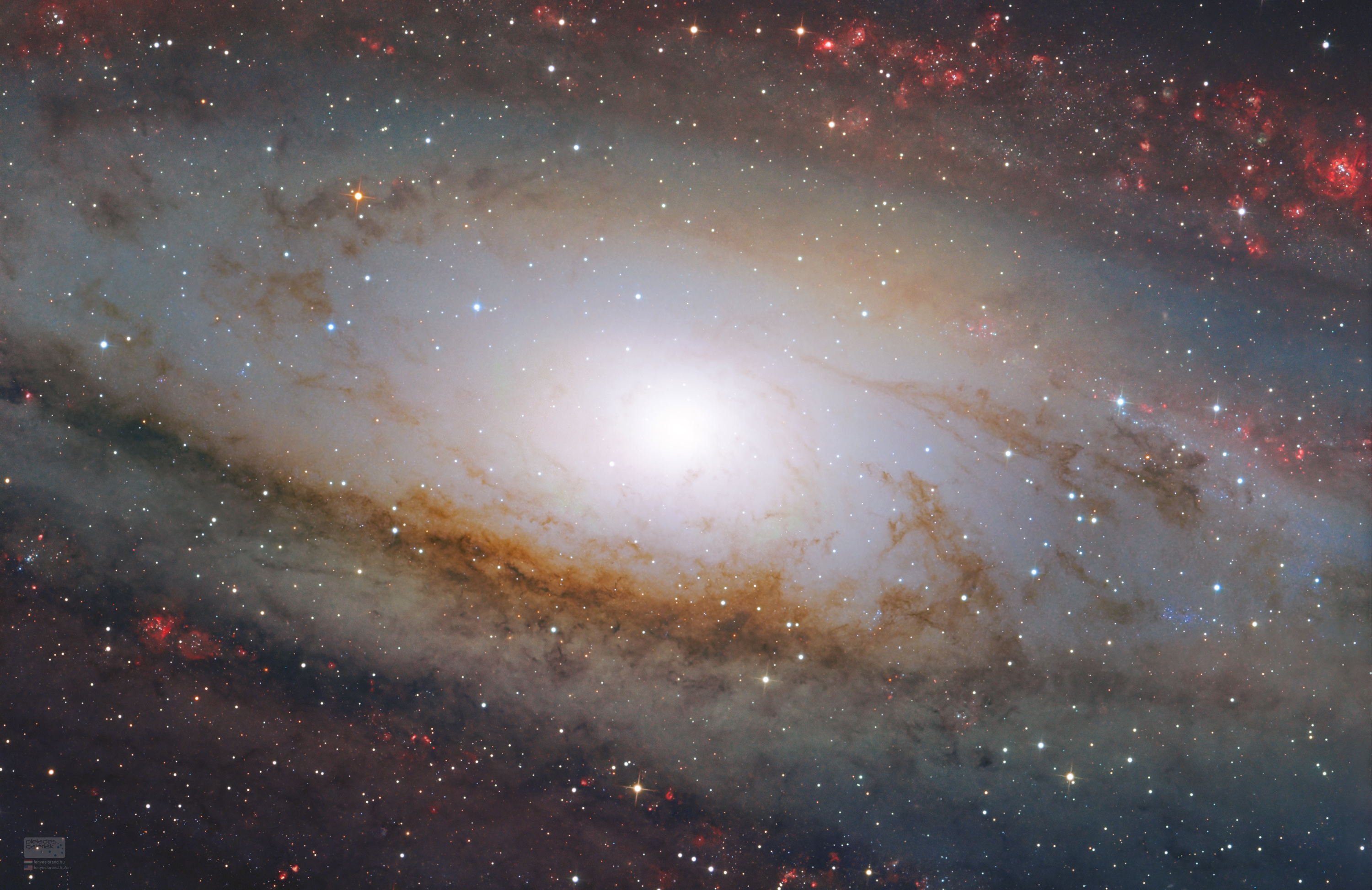 Az Androméda-galaxis, más néven az M31 hatalmas csillagváros. Az egyik legtávolabbi objektum, ami még szabad szemmel is észlelhető: 2.25 millió fényév távolságra helyezkedik el tőlünk. Azaz a fény ennyit utazott fénysebességgel az űrön keresztül, míg ideért az Androméda látszó képe hozzánk! A Charles Messier katalógusa szerinti 31-es számot viselő spirálgalaxis igazi égi kincsesláda. Sb típusú spirál, közepesen nyitott karokkal rendelkezik. Mivel azonban ferde nézőpontból látjuk, a karok nem vehetőek ki olyan egyértelműen, mint más galaxisok esetében. A kép a galaxis magvidékét mutatja be, nem a teljes objektumot. A fénylő galaxismag körül a porfelők látványos örvénylésén kívül a sugárzó hidrogén területek vörösei is látványosak ebben a nagy nagyításban már. A feltételezések szerint az M31 központját egy 30 millió naptömegű fekete lyuk alkotja.