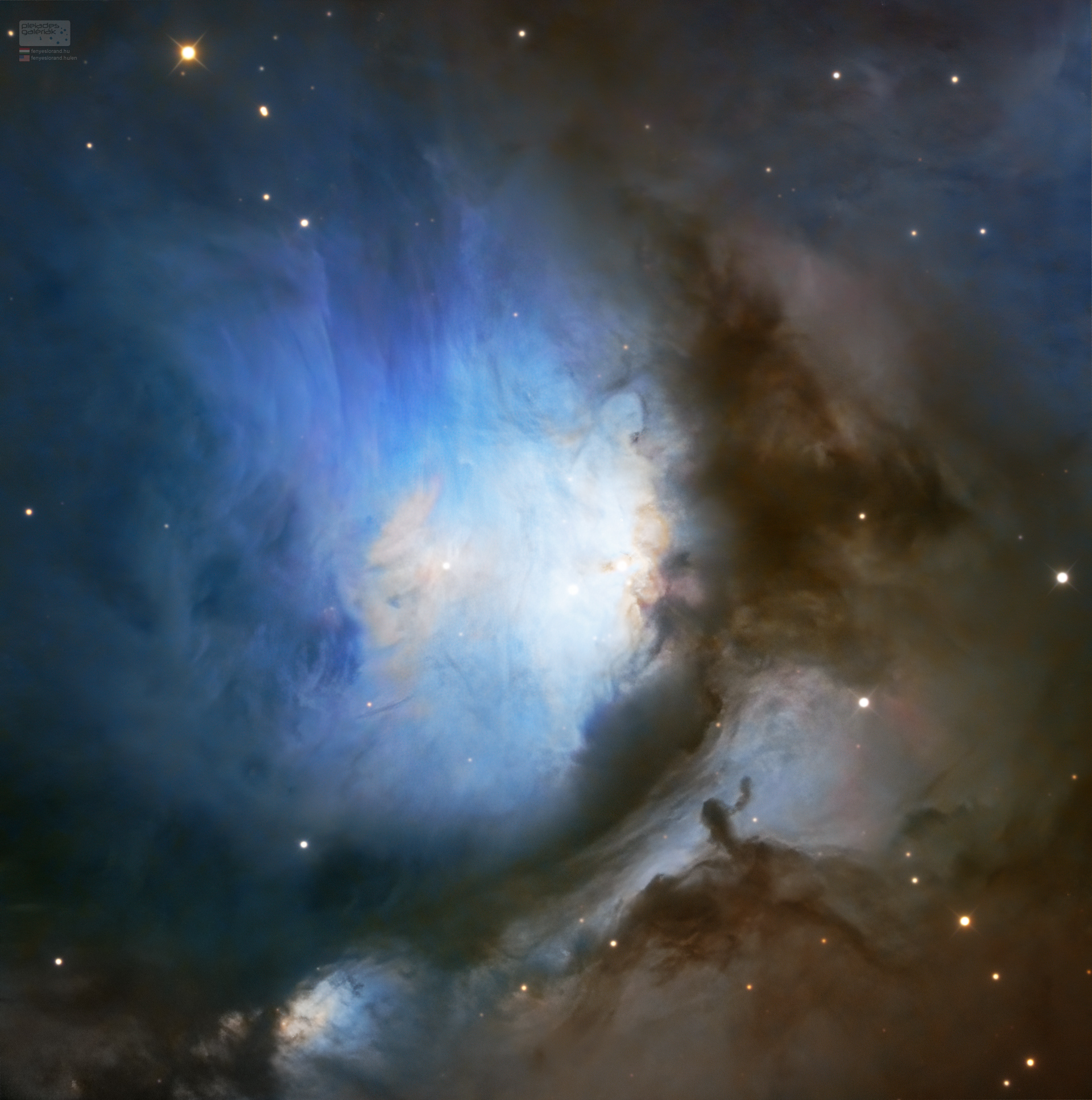 A fotó feldolgozása egyszerre volt nagy élmény és nagy küzdelem. Élmény önmagáért. Ahogy a bevezetőben leírtam, közel áll hozzám az objektum, mégsem tudtam az elmúlt 15 évben megfelelő képet készíteni róla. És küzdelem, mert egyrészt az Oriont csak a delelése körül fotózom az elérhető legjobb égminőség miatt (tehát nem túl sokáig tudom). Másrészt pedig azért, mert feldolgozni nagyon nehéz volt. Rengeteg a részlet, amit a nagy távcső ad, de ugyanezért rengeteg a hibalehetőség is. Rám egyébként is jellemző volt egyfajta bohém képfeldolgozás a múltban (inkább az összehatás érdekelt, mint a részletek maximális pontossága). Ezt kis felbontású képeknél nagyobb probléma nélkül el lehetett játszani. Azonban itt nincs az az alibi lehetőség, mint a kicsinél. De ez édes nehézség, csak hozzá kell nőjek. Itt a téma minden kis szegmense látszik. Sokkal nagyobb az önfegyelem igénye. Be is vezettem egy új megoldást, Váradi Nagy Pál barátom ugyan nem mélyégfotós, de roppant jó szeme van minden digitális hiba kiszúrására. Ő az, akivel véleményeztetem a képet és hiba esetén (amit ő jellemzően talál) szépen visszamegyek és nekifutok újra. Most is így történt, de a végeredmény miatt megérte.