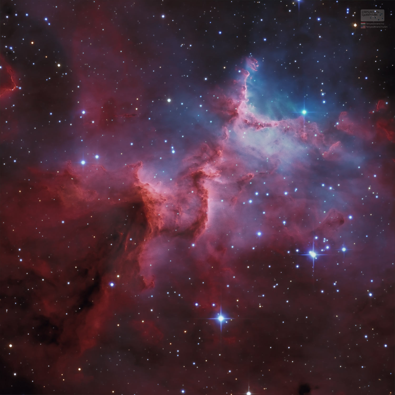 Az IC 1805 katalógusszámú Szív-köd mintegy 7500 fényévnyire, a galaxis Perseus-karjában található. Az középpontjában a Melotte 15 nevű laza szerkezetű nyílthalmaz találhatóm ezt láthatjátok a fotón. A köd pompás vörös színét a Melotte 15 által kibocsátott sugárzás okozza, a kékes színt pedig az OIII sugárzása adja hozzá a szép palettához A mindössze 1,5 millió éves halmaz néhány fényes csillagot tartalmaz, amelyek tömege közel 50-szerese a Nap tömegének, és még többet, amelyek tömege csak a naptömeg töredéke…