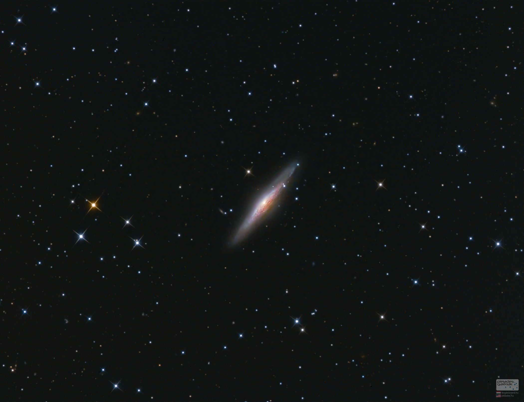 Az NGC 2683 galaxist William Herschel a képem készítése előtt kereken 231 évvel, 1788 februárjában fedezte fel. Ez a spirálgalaxis közel éléről látszik a Föld bolygóról, a megjelenése miatt az UFO-galaxis nevet ragasztották rá. Hogy ez mennyire szerencsés elnevezés, azt döntse el a kedves olvasó… Ám maga az objektum gyönyörű. A felvétel a szokásosnál részletesebb lett. Egyrészt új előhívási technikát fejlesztettem ki, másrészt az ég is kegyes volt velem februárban.