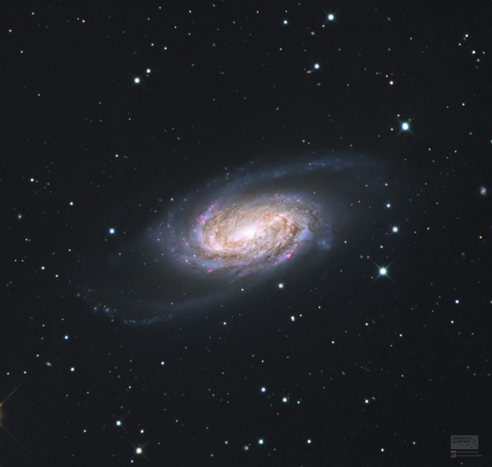 Nagyon érdekes útra léptem ezzel az új távcsővel. Többen is tanácsolták, hogy nem a sokszor fotózott TOP 20 objektumokból válasszak elsősorban témákat, hanem újdonságokat, friss témákat keressek. Egyet is értek ezzel. Most olyan apró égi objektumokat fotózom teljes látómezőben, amik korábban csak elvesztek a képeimen (összevetésül, az M81 galaxis már nem férne el ebbe a látómezőbe). A főszereplőnk is egy kis méretű csillagváros az Oroszlán csillagkép fejénél. De ebben a nagyításban gyönyörűen bomlik, gazdag csillagkeletkezési régiókat mutat.