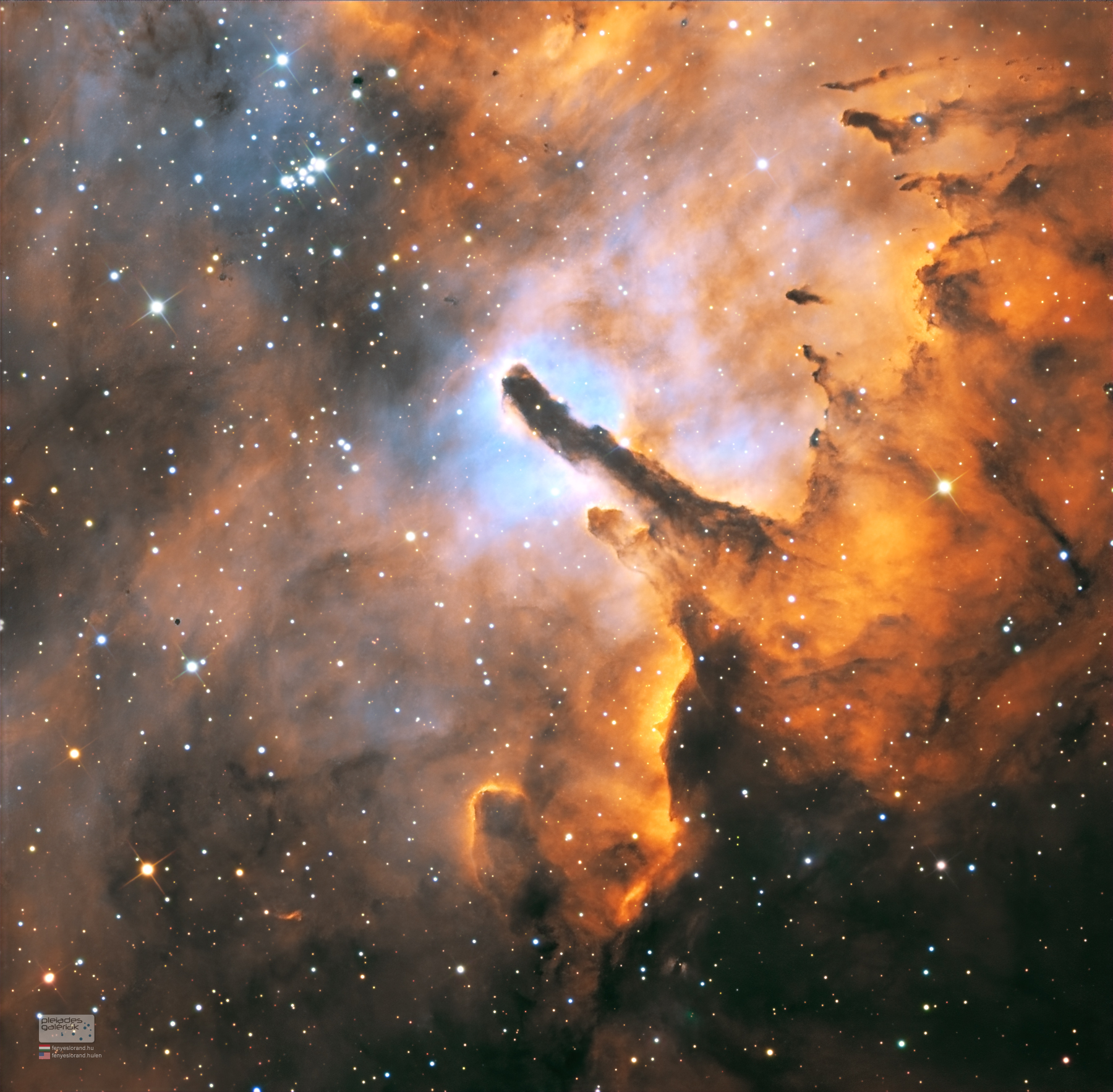 Az idei utolsó mono kamera + keskenysávú szűrős képének témájához mindenképp olyan objektumot igyekeztem keresni, ahol a nagy távcső szűk látómezeje jól érvényesül. A ragyogó csillaghalmaz felé mutató ujj, az ezt körülölelő csillagközi por remek kompozícióra adott lehetőséget.