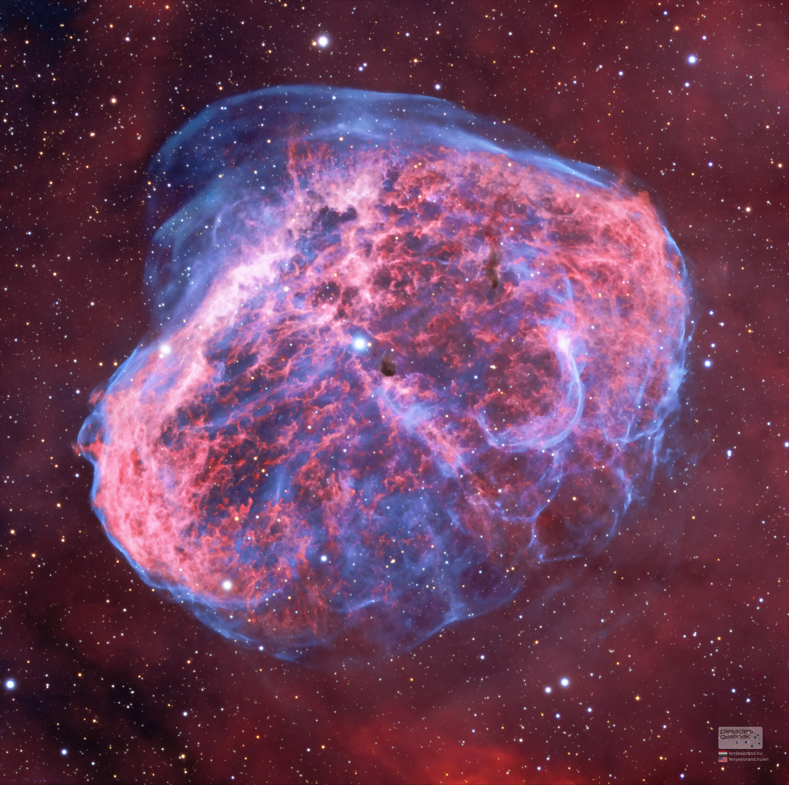 Az NGC 6888 vizuálisan észlelve nagyon érdekes objektum. A 20′ x 10′ méretű, ÉK-DNY irányú halo egyenetlenül fényességű. A leginkább ragyogó rész az ív északkeleten a legszembetűnőbb, éppen ott, ahol éles kanyarba kezd dél felé. A ködön keresztül a Tejútrendszer mezőcsillagainak sokasága ragyog. A kialakulásáról alább írok, érdemes elolvasni, igen nagy energiák csapnak össze ebben az érdekes ködösségben.
