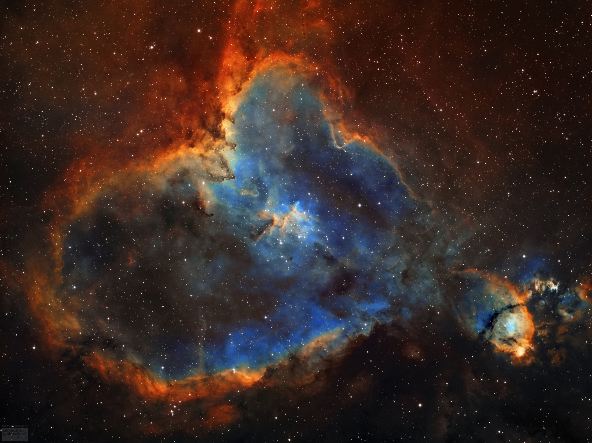 A jól ismert IC 1805 ködösség új arcát mutatja meg nekünk az idehaza még ritkán fotózott HST színpaletta segítségével. A köd otthonul szolgáló Cassiopeia a jellegzetes W alakja miatt jól ismert égi alakzat, még a csillagászatot közelebbről nem ismerők előtt is. Az északi félgömb egyik legnépszerűbb cirkumpoláris csillagképe számos gyönyörű mélyég-objektumot rejt, ám ezek közül is kiemelkedik a rendkívül jellegzetes alakú, szív formájú ködösség. Az IC 1805 megközelítőleg 7500 fényévre található a Napunktól, a Perseus-karban helyezkedik el. A Szív közepét a laza szerkezetű Melotte 15 halmaz uralja. A szív csúcsában található igen fényes csomó, külön katalógusszámot visel: NGC 896-ként ismerjük, fényessége miatt jóval korábban felfedezték, mint a teljes alakzatot. A nagy átfogásnak és a kiváló felbontásnak köszönhetően egy érdekes, az objektumtól független szereplő is felfedezhető a képen. Az érdekes ovális formát mutató, apró WeBo 1 planetáris köd jól kivehető a szív alakzat felett.